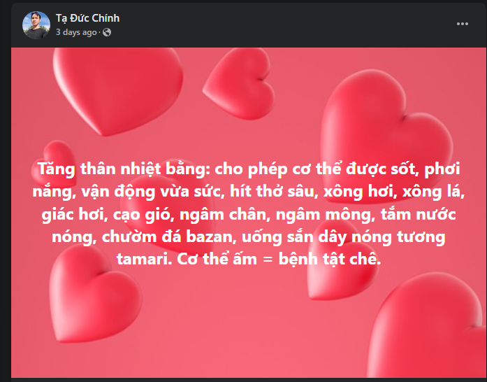 Tăng thân nhiệt bằng: cho phép cơ thể được sốt, phơi nắng, vận động vừa sức, hít thở sâu, xông hơi, xông lá, giác hơi, cạo gió, ngâm chân, ngâm mông, tắm nước nóng, chườm đá bazan, uống sắn dây nóng tương tamari. Cơ thể ấm = bệnh tật chê.